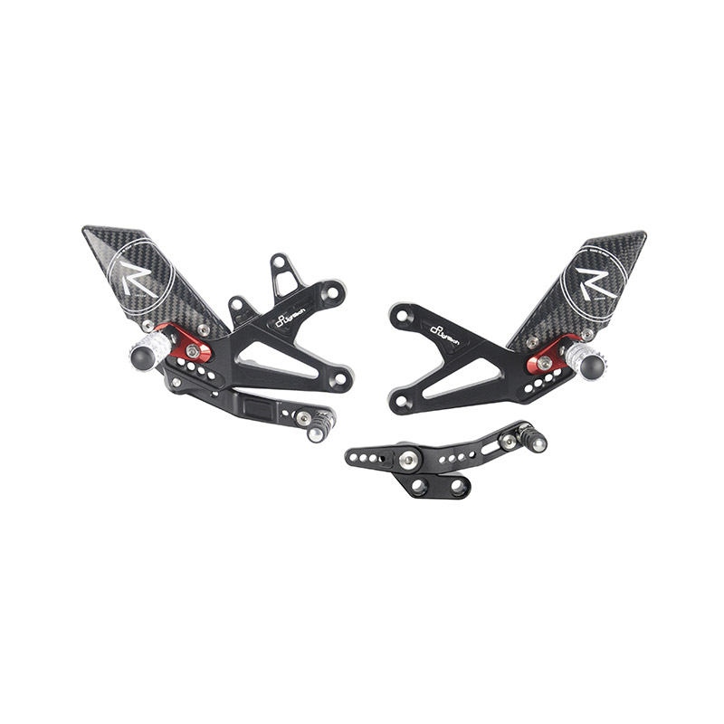 Pedane Regolabili Versione “R” Con Poggiapiede Pighevole Silver, Puntalino Di Comando Pieghevole, Paratacco In Carbonio “White R”, Supporto Poggiapiede Anodizzato Rosso, Cuscinetti Ad Alto Scorrimento E Bulloneria In Titanio.