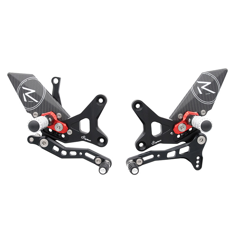 Per tutti i modelli di pedane Track-System, LighTech è lieta di presentarvi la versione “R”! Questa versione speciale è il top in fatto di pedane regolabili: – paratacchi in carbonio a trama rossa con logo “R” rosso – poggiapiedi e puntalini pieghevoli – cuscinetti SKF ad alta scorrevolezza – viteria principale in titanio grado-5 – supporti poggiapiede di colore rosso Tutto questo per ottenere il massimo feeling del pilota col proprio mezzo e la massima precisione durante gli spostamenti sulla sella ed i rapidi cambi marcia e per offrire non solo elevati contenuti tecnici ma anche un look assolutamente unico e molto ricercato, in grado di caratterizzare l’estetica della moto rendendola molto più attraente. LighTech fornisce tutti ricambi per un eventuale ripristino delle pedane in caso di caduta o di smarrimento di qualche componente.