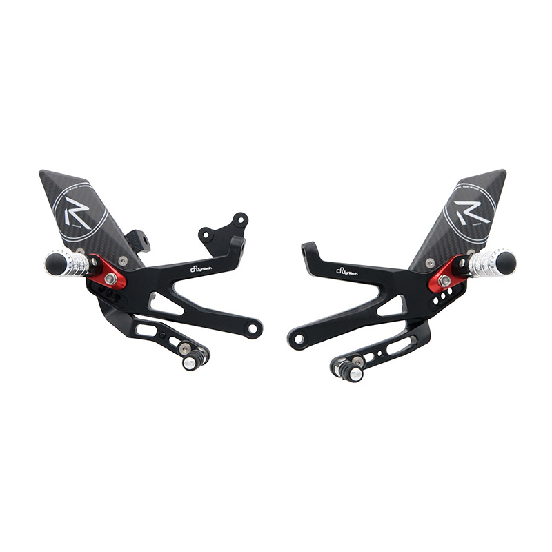LighTech è lieta di presentarvi la versione “R”! Questa versione speciale è il top in fatto di pedane regolabili: – paratacco in carbonio nero rosso -supporto poggiapiede rosso – poggiapiedi e puntalini pieghevoli – cuscinetti High Quality – viteria principale in titanio.