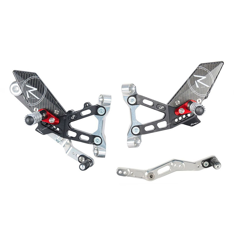 Pedane Regolabili Versione “R” Con Poggiapiede Pighevole Silver, Puntalino Di Comando Pieghevole, Paratacco In Carbonio “White R”, Supporto Poggiapiede Anodizzato Rosso, Cuscinetti Ad Alto Scorrimento E Bulloneria In Titanio.
